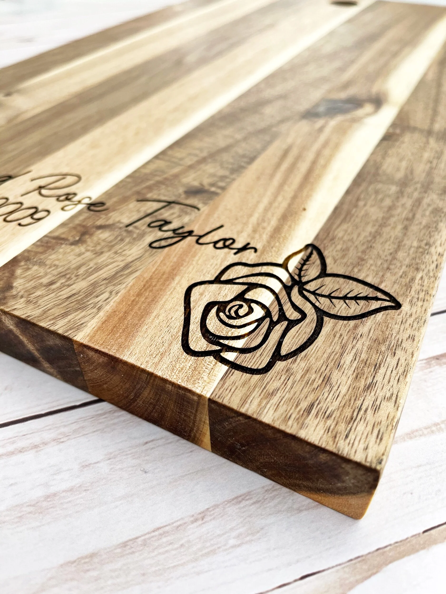 This gorgeous acacia board would look great as a kitchen themed sign, or as a function cutting board. It measures 12”x17.5” and has a hole in the top for hanging.